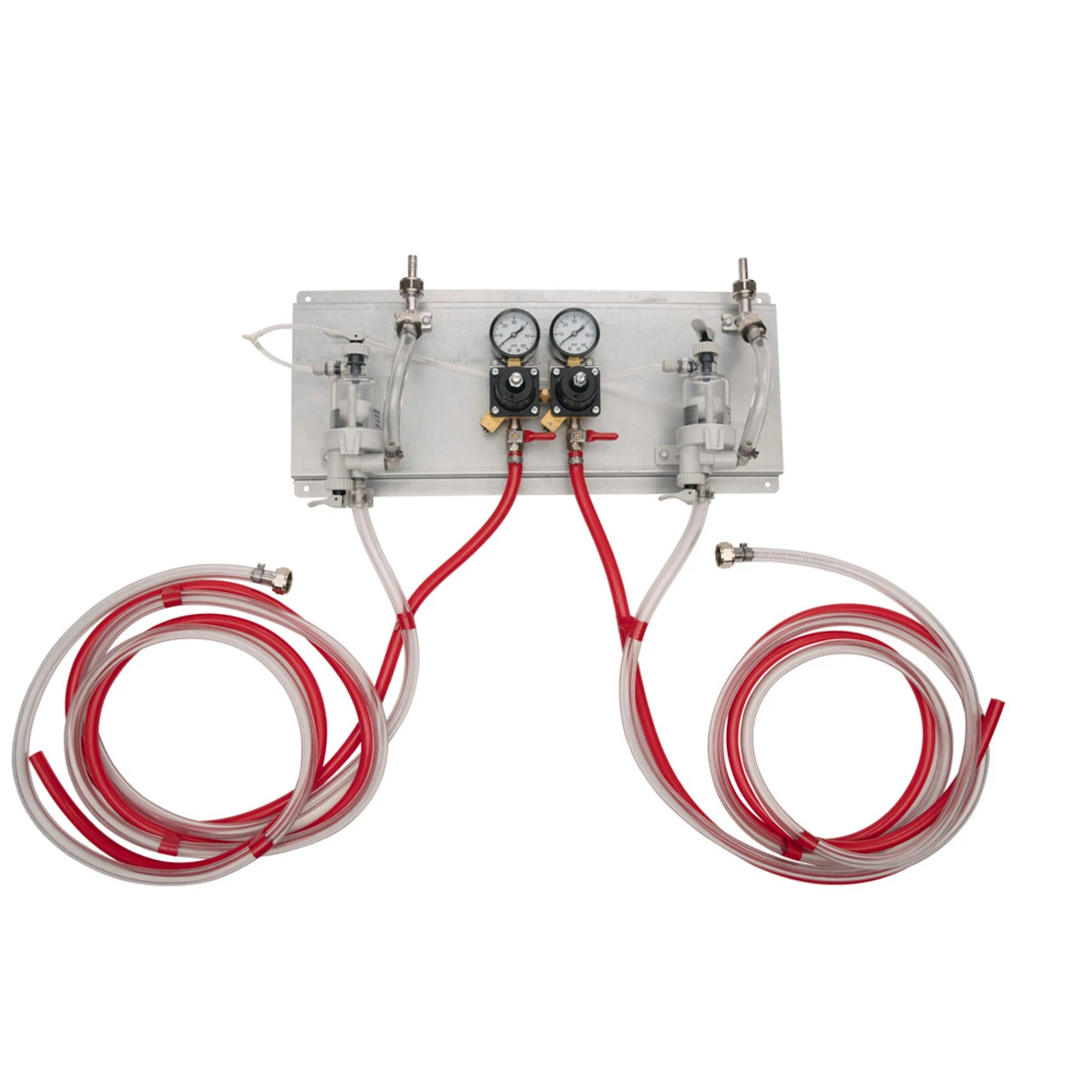 This CO2 manifold system includes 2 beer lines, 2 red air lines, two CO2 regulators, two beer FOBs, a mounting panel, and two gas shut-off valves.