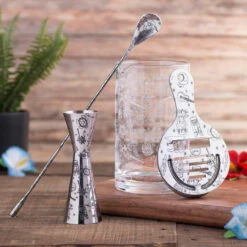 Urban Bar Tiki Pattern Mixing Glass & Bar Tool Set – 4 Pieces