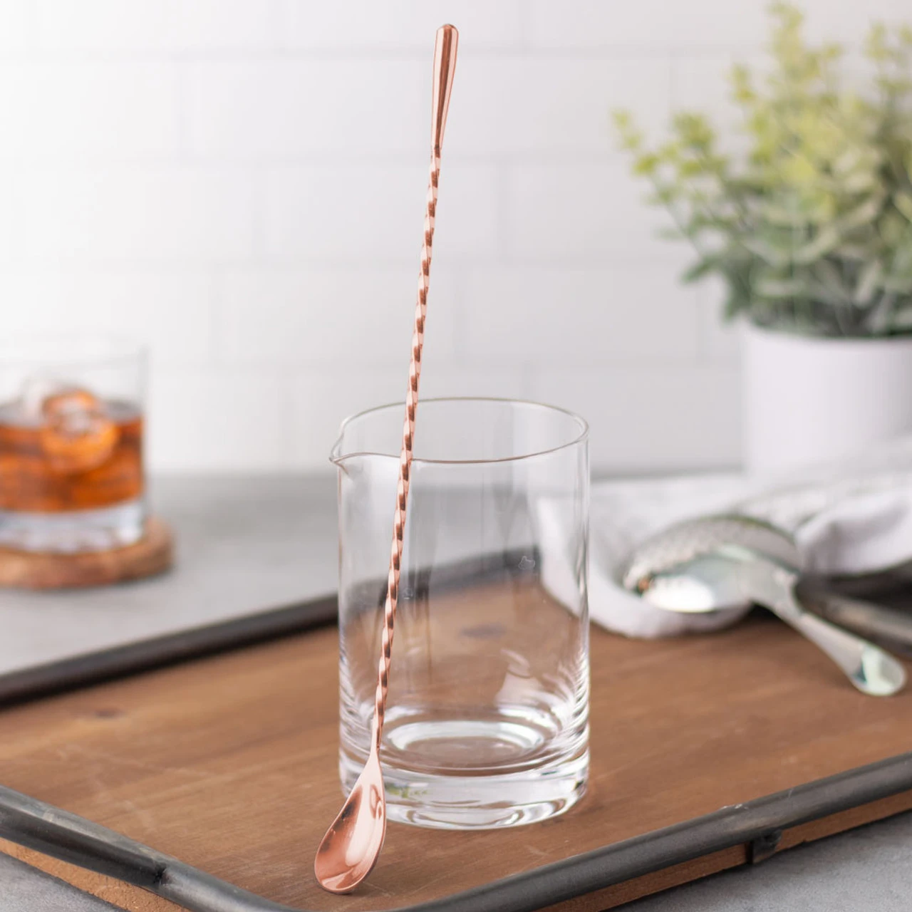 The hand blown glass is paired with a perfectly balanced mixing spoon made from durable 304 stainless steel with a warm, copper-plated finish, which features a weighted teardrop tip. Its functional twisted coil handle is the choice of professional bartenders for its ability to travel efficiently around the mixing glass. The copper provides a striking compliment to the copper cups used to serve frosty mint juleps or Moscow mules.