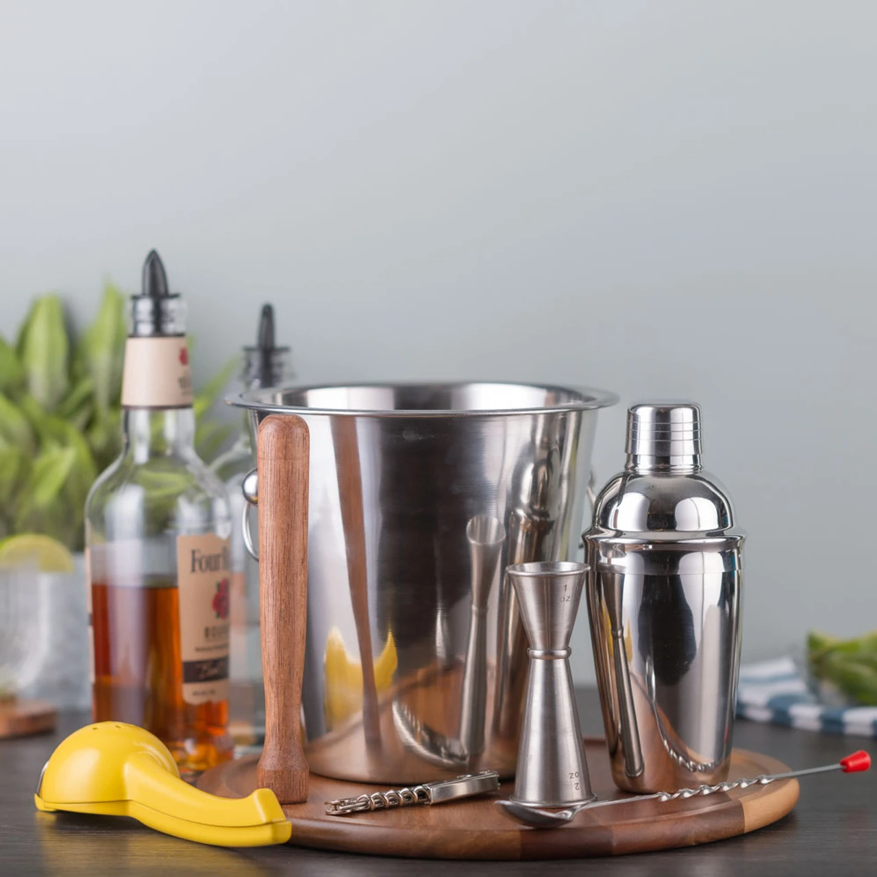 The stainless steel cocktail shaker/strainer, jigger, & bar spoon, plastic bottle pourers, wooden muddler, and durable citrus squeezer are essential bar tools for making cocktails. And when you need to class it up the corkscrew allows for easy opening of your favorite bottle of vino.