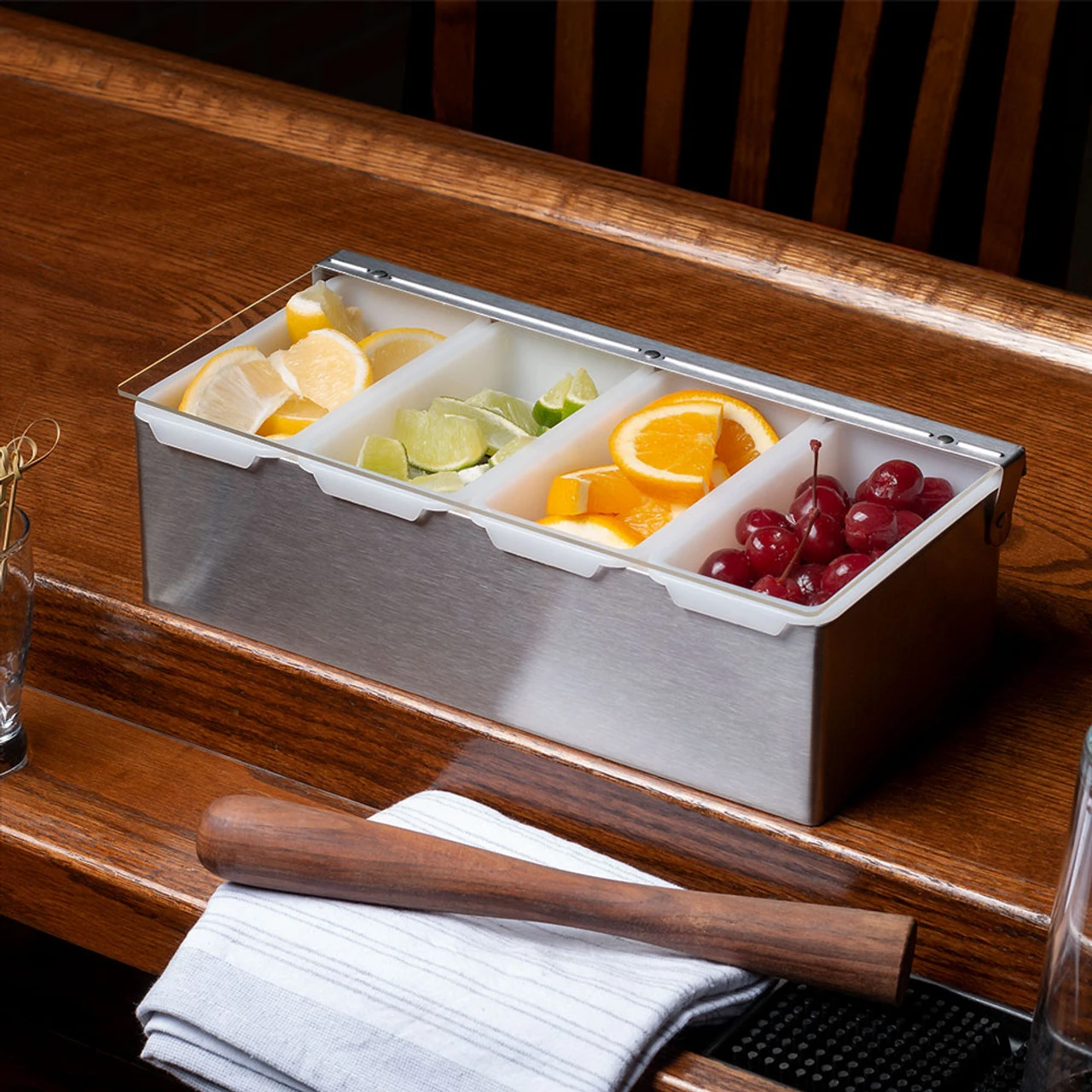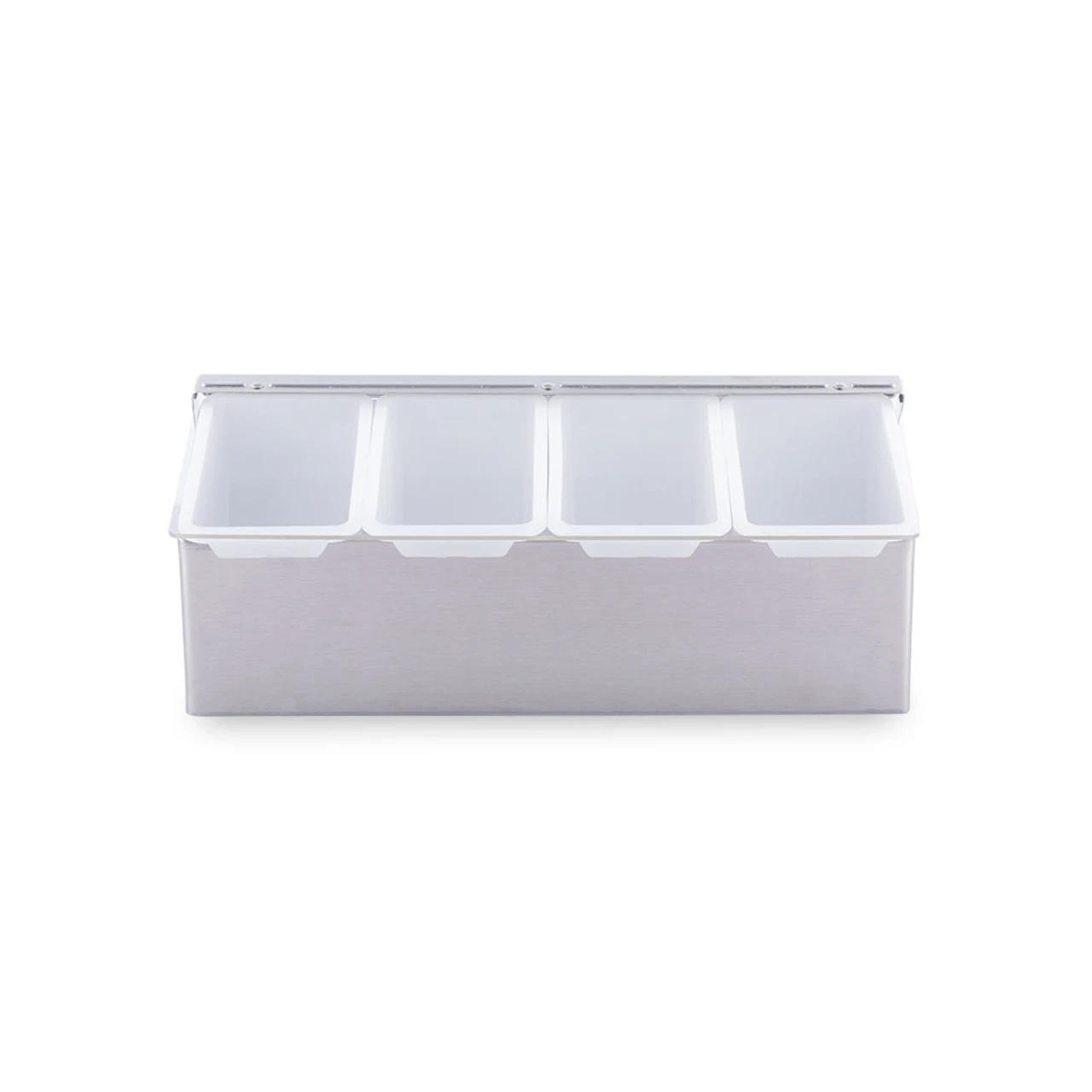 Perfect for professional bar presentation and organization, this bar fruit tray features four plastic compartments for holding garnishes. This bar condiment holder is made from sturdy stainless steel and features a clear plastic lid to keep debris and fruit flies away.