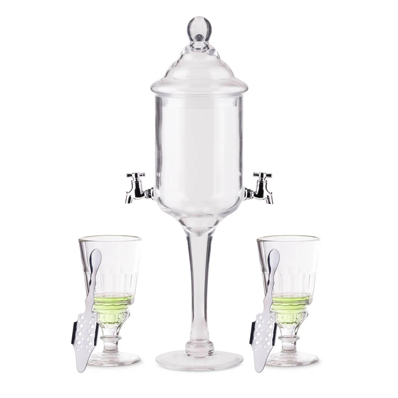 The kit comes with everything you need to perform an absinthe louche: a glass absinthe fountain with two faucets, a pair of La Rochere Reservoir Pontarlier style glasses and two French style absinthe spoons.