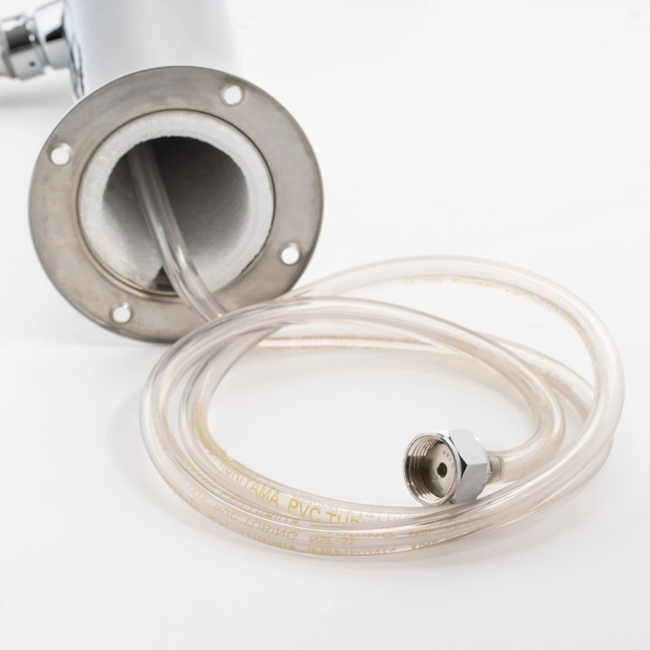 Measuring 2 ½ inches in diameter, the beer tower includes a matching chrome-plated faucet with brass lever. For easy installation, your tower comes with a 4-ft. beer line, hex nut connectors, mounting gasket.