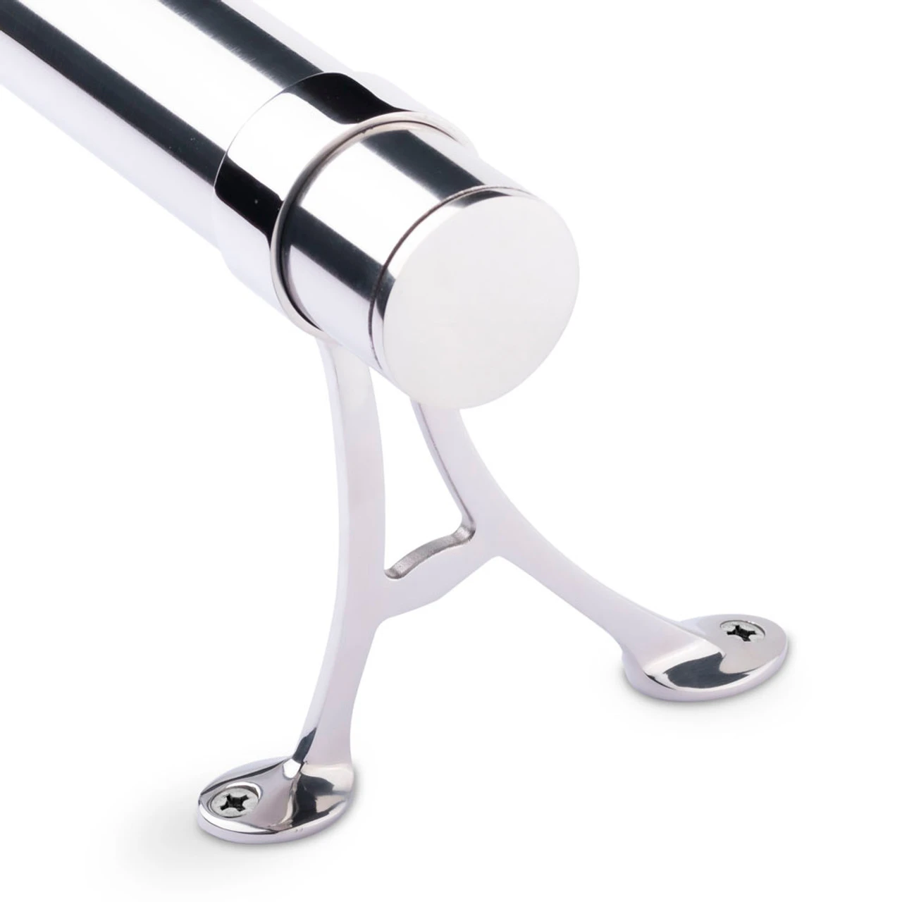 When mounted properly, the bar rail will sit 5.5″-6″ off the floor. With two contact points, this double-footed bar rail bracket will hold up well to long-term and heavy use. For proper support, bar brackets should be placed at each end of the tubing, plus one for every 4-foot increment. Be sure to measure precisely where to place the screws ahead of time.