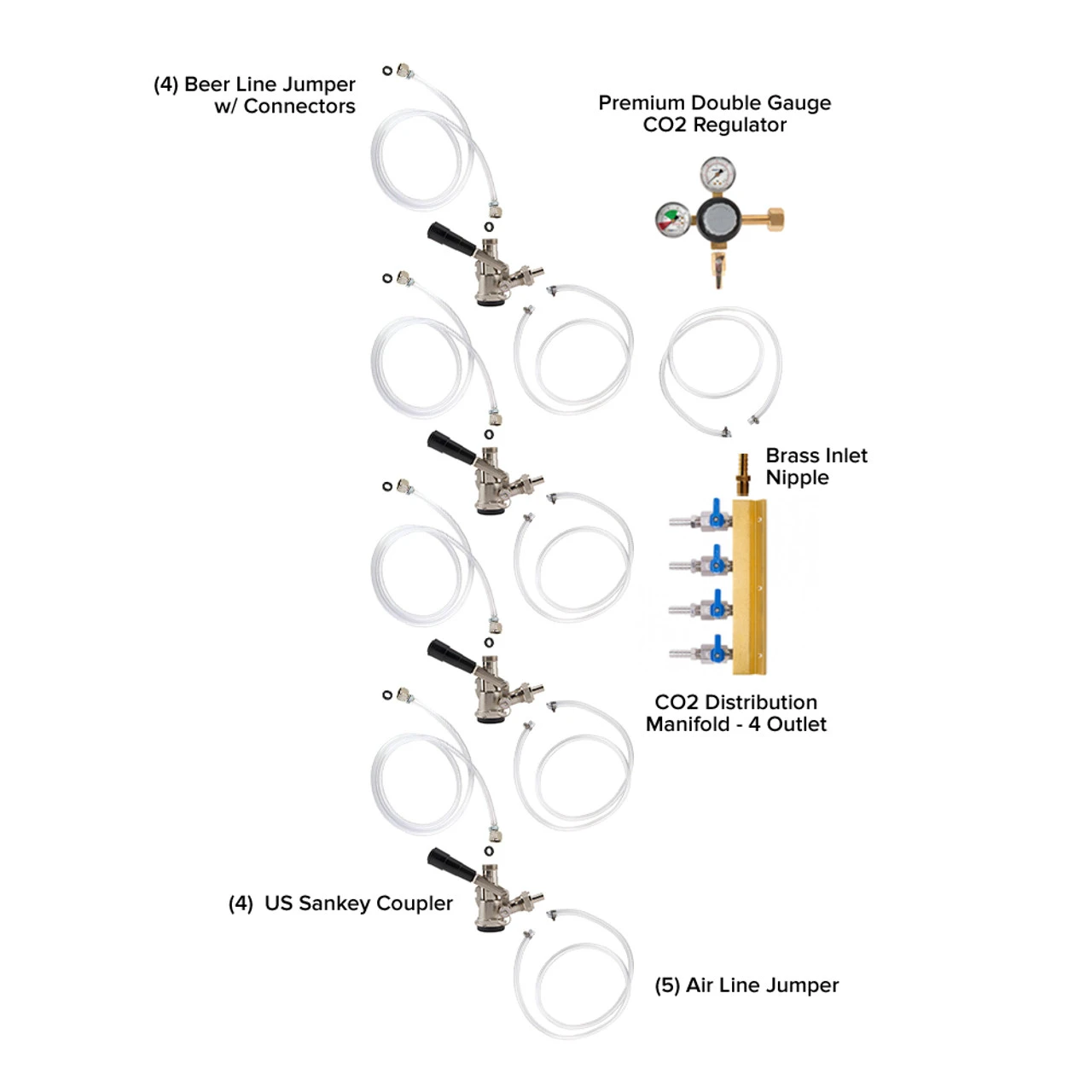- Four keg couplers (Sankey D), manifold and dual-product CO2 regulator included