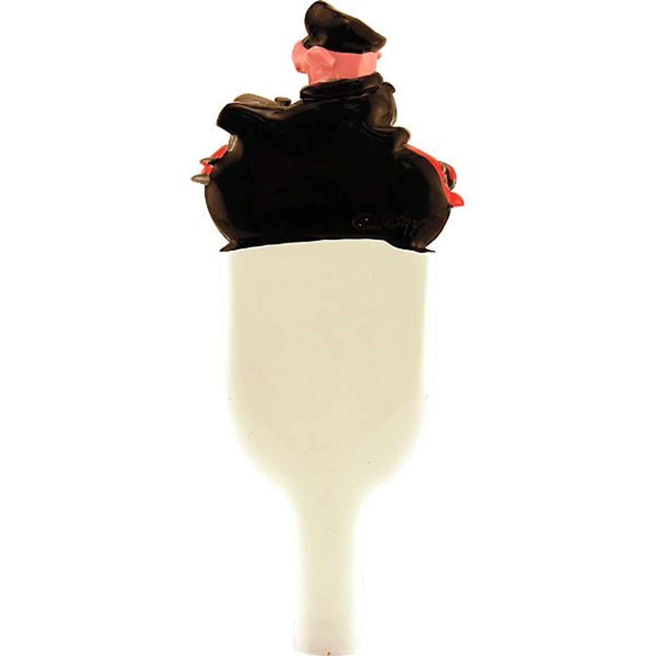 This novelty beer tap handle features the sculpture of a pig, dressed in leather gear, riding a red motorcycle. The paddle of the handle looks like an asphalt road with yellow dotted line.