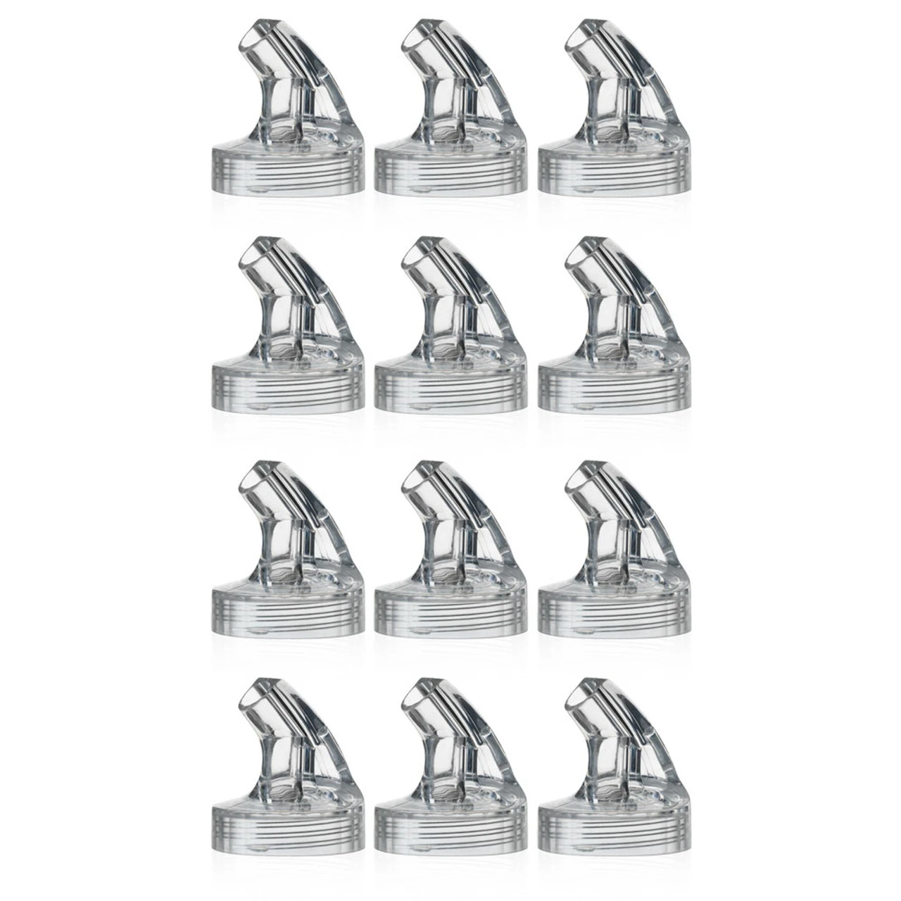 Each pourer in this pack of 12 is made of clear plastic and screws into the top of the 60 and 64-ounce PET bottles, the types commonly used at large events like weddings to store juice for the bar. The pourers control how liquid dispenses from the bottles, increasing the accuracy of pours and eliminating accidental spills when making drinks for a crowd.