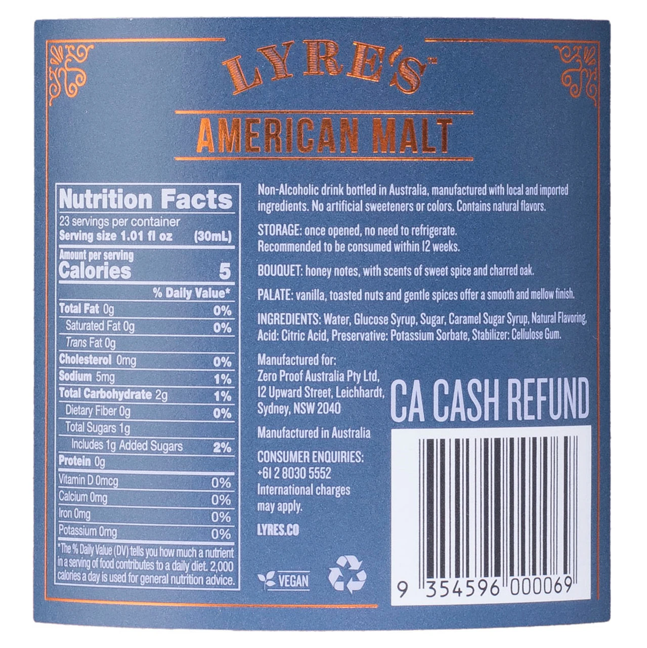 Lyre’s American Malt is a premium, non-alcoholic beverage that mimics the taste of bourbon whiskey. It has generous flavors of vanilla and toasted nuts with herbal notes providing a complexity, offset by a long mellow finish, the gently spiced palate results in the flavors remaining well after finishing. It features the same natural essences, extracts and distillates that match the aroma, taste and appearance you find within time tested classics.