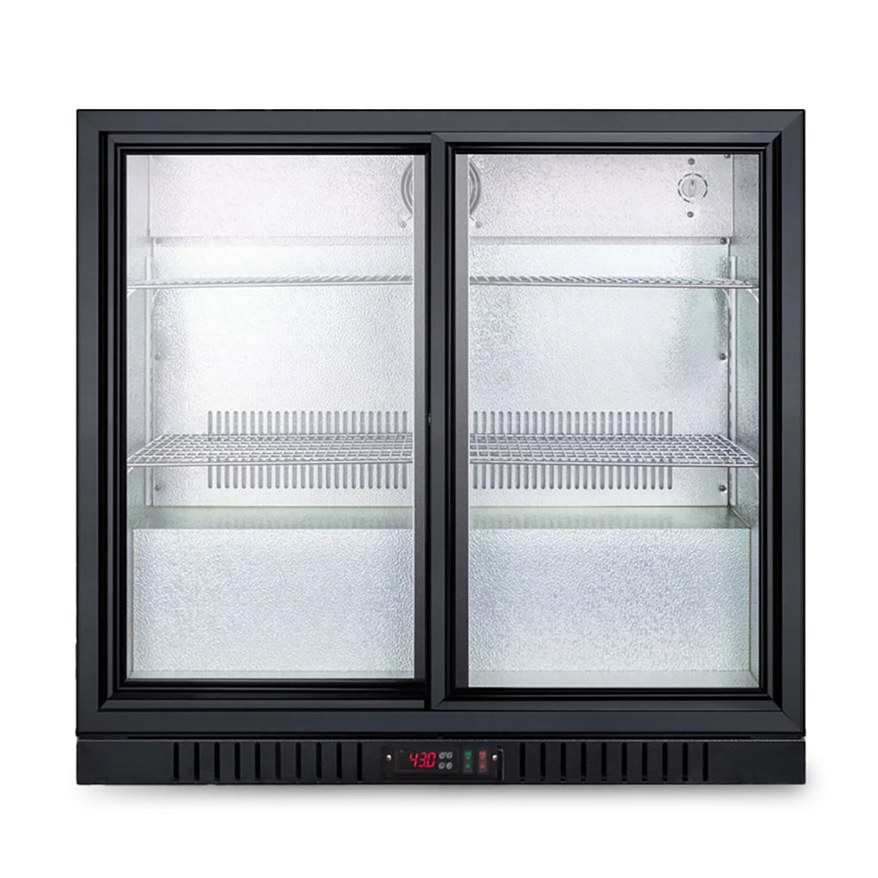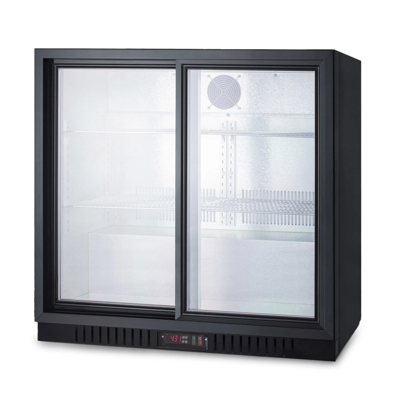 This 36″ wide beverage cooler with glass doors features a digital thermostat to properly chill your beverages as well as adjustable chrome shelves on a cantilevered system to maximize your space. The two self-closing doors swing open and come with factory-installed locks on each to keep people out after hours. An interior light makes it easy to see the cooler’s contents as well.
