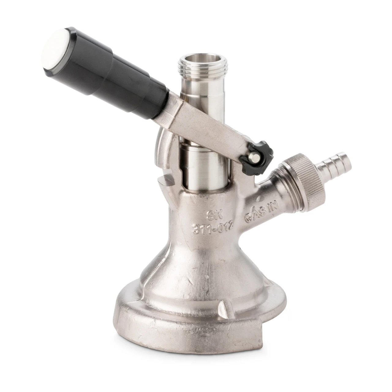 Simply put, your draft beer dispensing will be a failure without the right keg coupler. On any draft beer system, the coupler, or keg tap, allows the gas tank to supply pressurized CO2 into the keg. You attach the bottom of the coupler to the keg valve, the gas line to the side hose nipple, and the beer line on top of the coupler. When in use, the result is beer being pushed up the beer line toward the draft faucet.