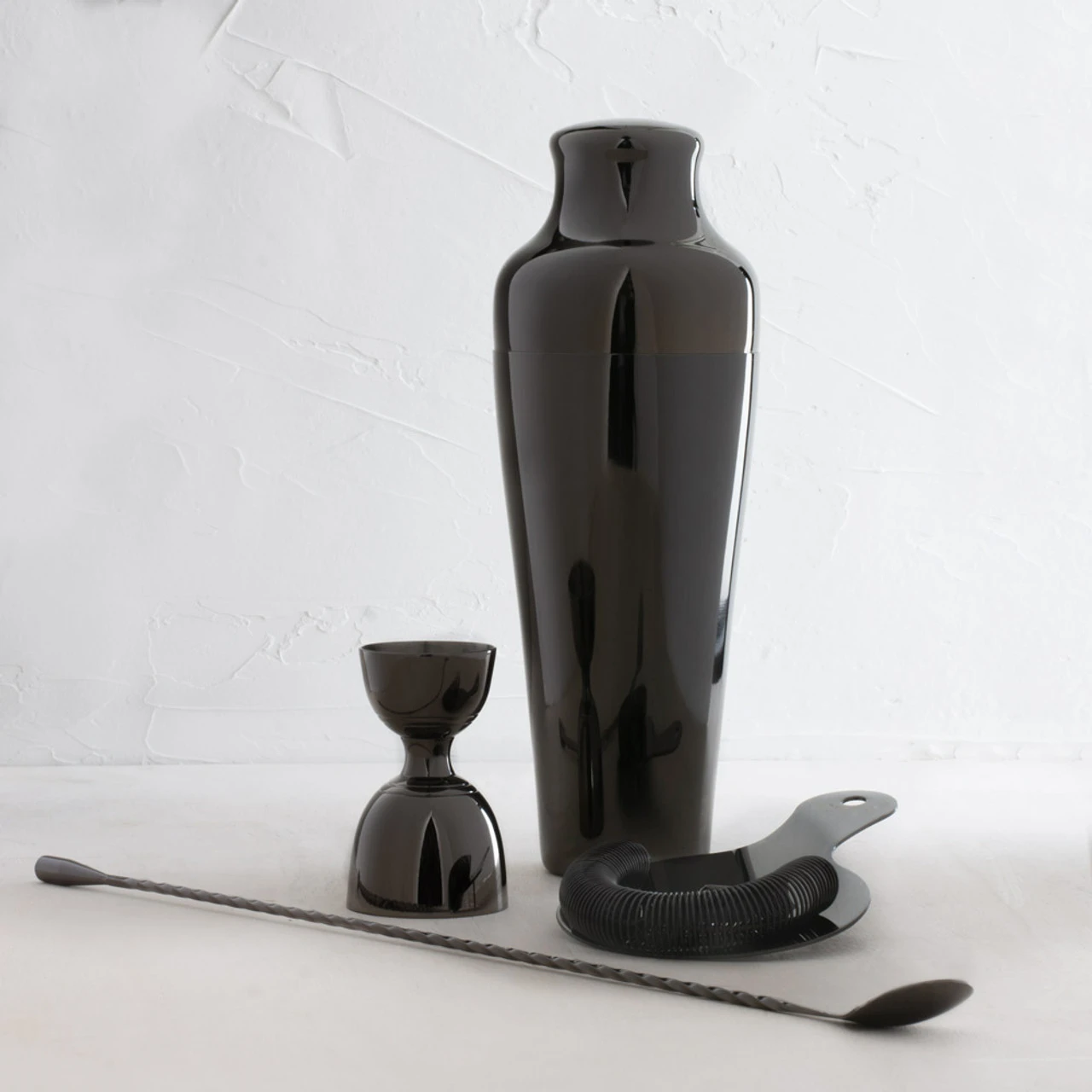 This set of vital bar tools and equipment features many of a mixologist’s best friends, including a cocktail shaker, bar spoon, double jigger, and Hawthorne strainer.